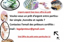 OFFRE DE PRÊT ENTRE PARTICULIER très très rapide en France et à proximité.Avez-vous besoin d'un prêt fiable ?contactez le mail : ( legalpreteur@gmail.com ) nous offrons de 1000 ? a 10 000 000 ?-bonjour a tous-