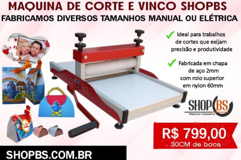 Máquina de Corte e Vinco, aplica-se em trabalhos de corte que exijam precisão e produtividade, substituindo a tesoura. Corta os seguintes materiais: Papelão e papel: caixinhas para presentes, Mini envelopes e etc. Peças em couro para fabricação de bolsas, carteiras, cintos e etc. Guarnições e juntas em borracha, laminados plásticos e papel fotográfico aplicado sobre manta magnética. E.V.A. para produção de brinquedos pedagógicos ou para decoração de festas. Para corte de produtos como quebra-cabeças, porta-retratos, lembrancinhas